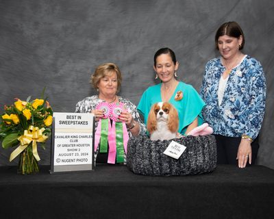 I remember well the day Anetrius and I went to Dorothy's house to photograph Susie's litter. I positioned the puppies while Dorothy and Anetrius took the photos. I knew I wanted a foundation bitch from these puppies, but I was torn between two girls. They both had classic Cavalier faces with wide white blazes between dark brown eyes, typey structure, good angulation, and silky, straight, well broken coats. After I studied the photos though, I realized my eye kept being drawn to Susie's show side stack shot. She had a pretty layback of shoulders that transitioned beautifully into a perfectly level topline and excellent proportions - not too tall, not too short, not too long, not too wide. What sealed the deal for me ironically was something that many other breeders would not have tolerated in a show dog: she has a small brown freckle on her nose (we call it a "kiss") which exactly matched her father's kiss. But I knew from showing and stewarding that the vast majority of judges only notice markings if they distract from the dog's overall look, and I also knew that Susie would not have that problem. Her huge eyes, soft expression, sound structure, and gorgeous side gait would command far more attention than her Marilyn Monroe beauty mark.